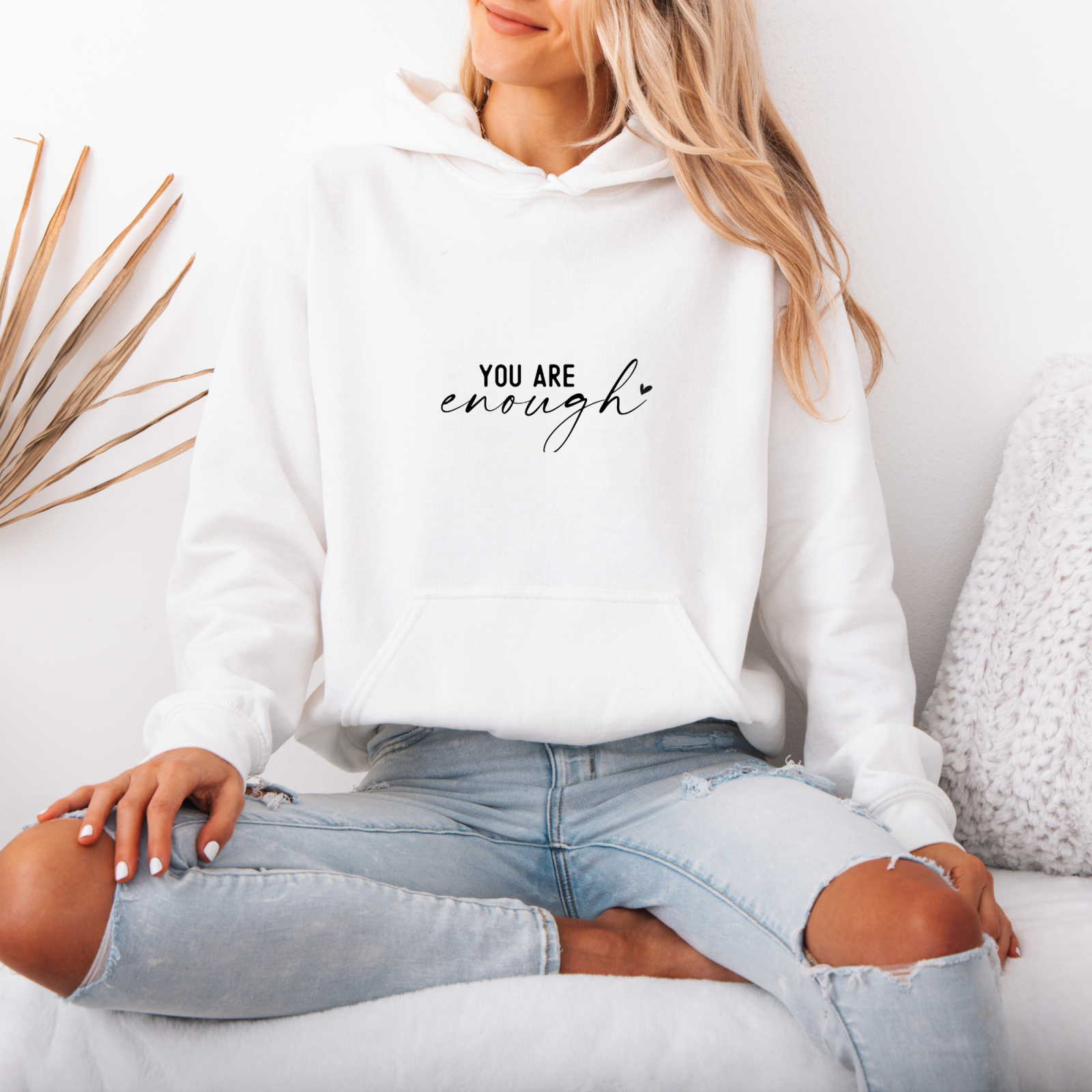 Un reminder simplu și puternic: „You Are Enough”. Acest hanorac alb, cu mesaj motivațional imprimat discret în negru, este alegerea ideală pentru zilele în care vrei să îți exprimi încrederea și autenticitatea.