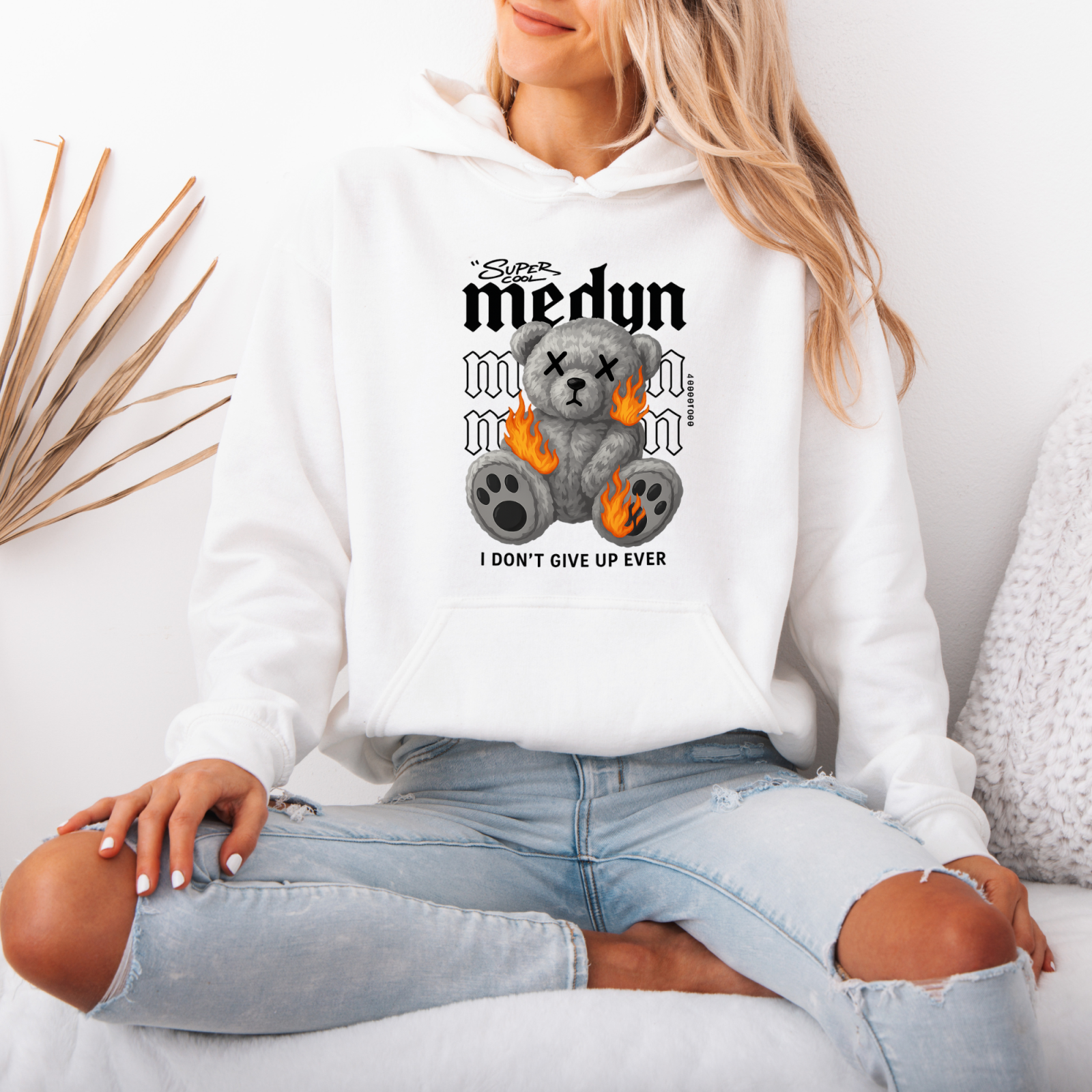 Arata-ti determinarea cu acest hanorac alb de dama cu imprimeu Ursulet „I Don’t Give Up Ever” Medyn, un design puternic si plin de atitudine. Ursuletul gri cu flacari si mesajul motivational transmit energie si incredere, fiind perfect pentru tinutele urban streetwear.