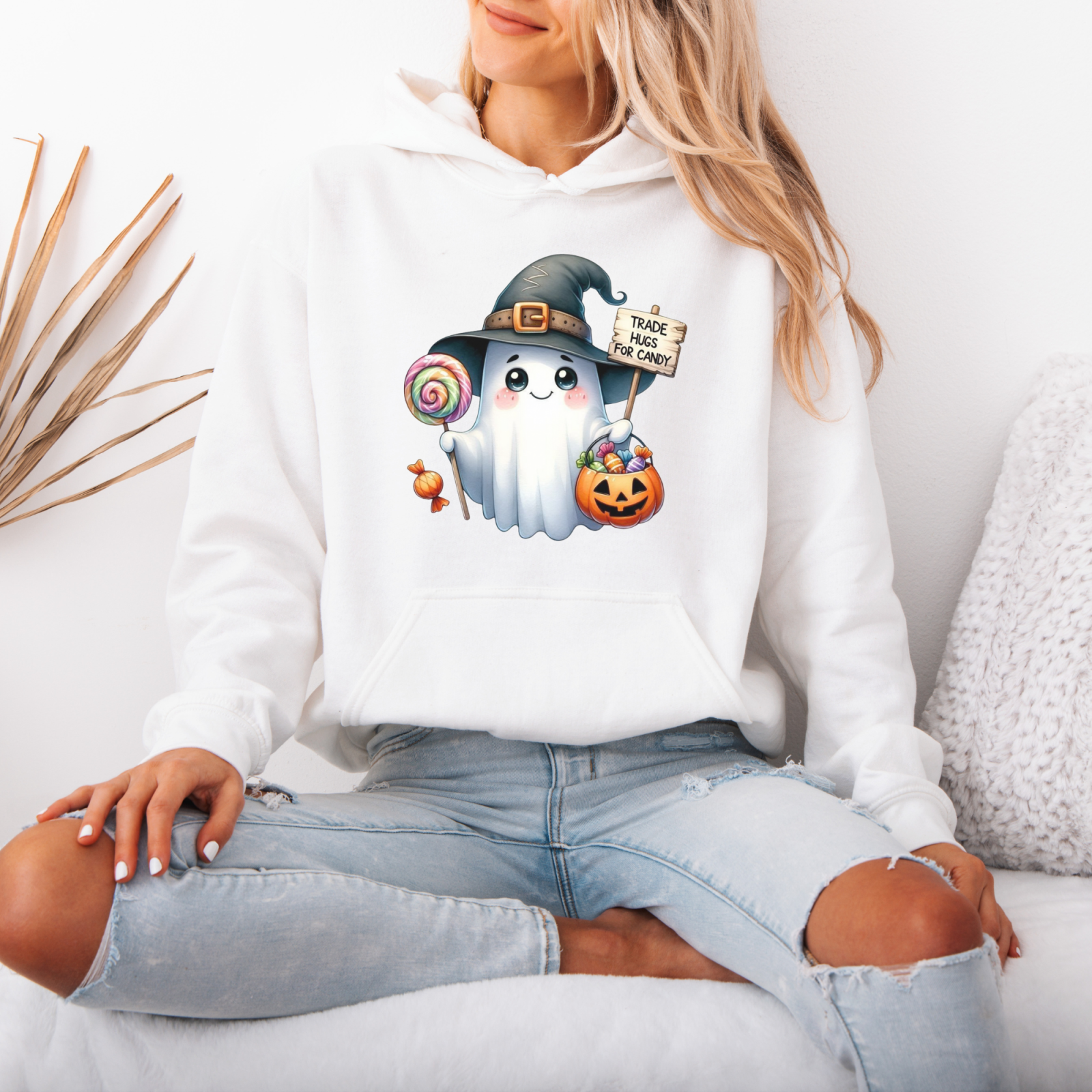 Adauga un strop de magie si umor garderobei tale de toamna cu hanoracul Trick or Treat Ghost! Designul vibrant infatiseaza o fantomita simpatica cu palarie de vrajitoare, tinand o acadea colorata si o galetusa cu bomboane — perfect pentru cei care iubesc Halloweenul intr-o nota vesela, nu infricosatoare.